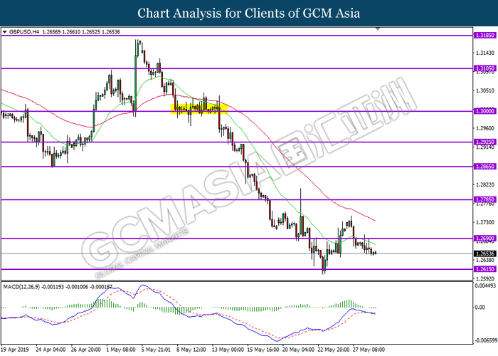 GBPUSD, H4: GBPUSD telah didagang dengan lebih rendah susulan dengan pengunduran dari tahap rintangan di 1.2690. MACD yang memaparkan momentum bearish dengan formasi silang kematian mencadangkan pasangan ini untuk melanjutkan kerugiannya ke arah tahap sokongan di 1.2615.