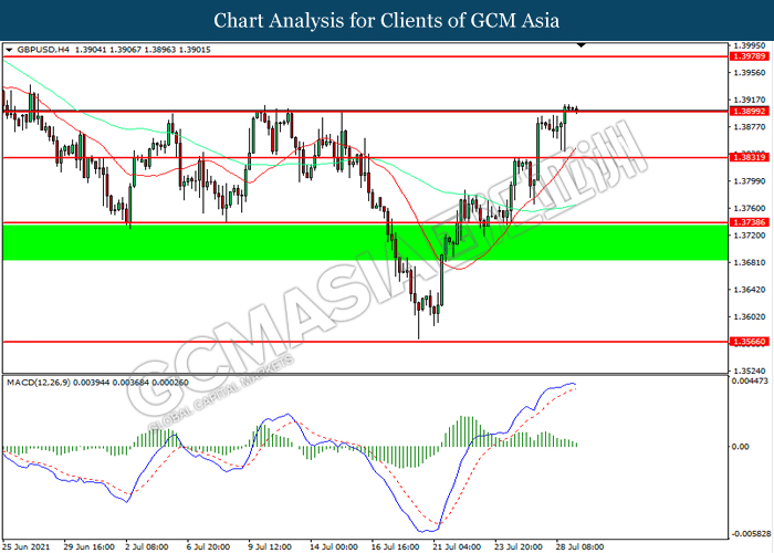 GBPUSD, H4: GBPUSD telah didagang dengan lebih tinggi sementara kini menguji di tahap rintangan 1.3900. Namun, MACD yang memaparkan momentum bullish yang berkurangan mencadangkan pasangan ini untuk mengalami pembetulan teknikal bagi jangka pendek.