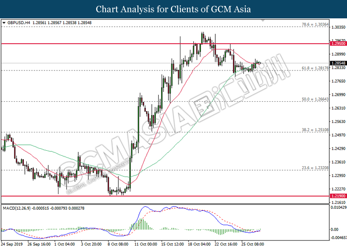 GBPUSD, H4: GBPUSD telah didagang secara rata berdekatan dengan 1.2820. MACD yang memaparkan isyarat bullish mencadangkan pasangan ini untuk didagang dengan lebih tinggi bagi jangka pendek sebagai pembetulan teknikal.