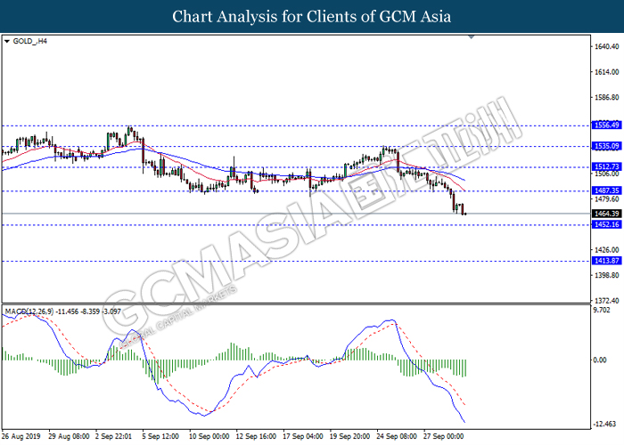 GOLD_, H4: Harga emas telah didagang dengan lebih rendah selepas ia memecah tahap sokongan terdahulu 1487.35. MACD yang memaparkan momentum bearish mencadangkan komoditi ini untuk melanjutkan kerugiannya ke arah tahap sokongan 1452.15.