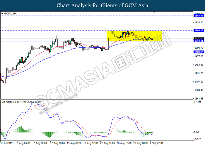 GOLD_, H4: Harga emas telah didagang dengan lebih rendah sementara ia sedang menguji berhampiran dengan tahap sokongan 1519.00. Namun, MACD yang memaparkan isyarat momentum bearish mencadangkan komoditi ini untuk didagang dengan lebih tinggi sebagai pembetulan teknikal jangka pendek ke arah tahap rintangan 1548.10.