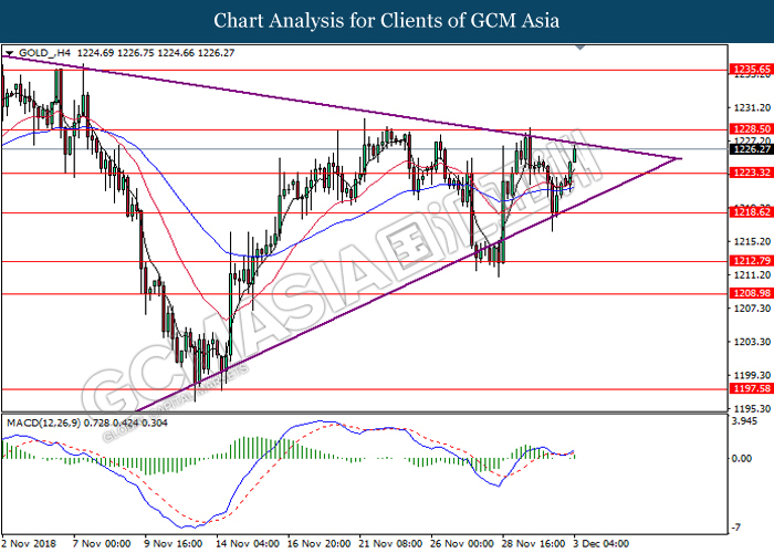 GOLD_, H4: Harga emas telah didagang dengan lebih tinggi selepas ia memecahkan sasaran di 1228.00. MACD yang memaparkan isyarat bullish mencadangkan harganya untuk meningkat selanjutnya dan menuju ke arah 1237.25.
