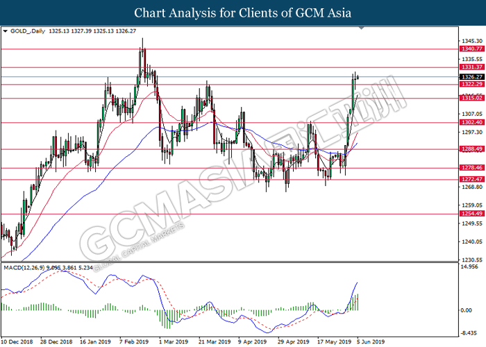 GOLD_, Daily: Harga emas telah didagang dengan lebih tinggi selepas pemecahan berlaku di tahap rintangan 1322.30. MACD yang memaparkan momentum bullish mencadangkan harganya untuk meningkat dan menuju ke arah 1331.35.