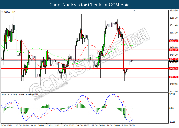 GOLD_, H4: Harga emas telah didagang dengan lebih tinggi sementara kini menguji di tahap rintangan 1491.65. MACD yang memaparkan momentum bearish yang berkurangan mencadangkan komoditi ini untuk melanjutkan keuntungannya selepas ia memecah tahap rintangan tersebut.