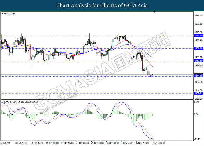 GOLD_, H4: Harga emas telah didagang dengan lebih rendah sementara ia sedang menguji tahap sokongan 1460.00. Namun, MACD yang memaparkan isyarat momentum bearish yang telah berkurangan mencadangkan komoditi ini untuk didagang dengan lebih tinggi sebagai pembetulan teknikal ke arah tahap rintangan 1480.50.