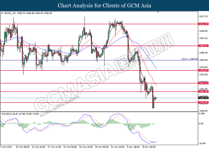 GOLD_ H4: Harga emas telah didagang dengan lebih tinggi selepas ia memecah tahap rintangan terdahulu 1452.70. MACD yang memaparkan momentum bullish mencadangkan komoditi ini untuk melanjutkan keuntungannya ke arah tahap rintangan di 1461.00