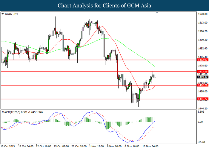 GOLD_, H4: Harga emas telah didagang dengan lebih rendah selepas ia berundur dari tahap rintangan 1473.60. MACD yang memaparkan momentum bullish yang berkurangan mencadangkan komoditi ini untuk melanjutkan kerugiannya ke arah tahap sokongan 1462.75.