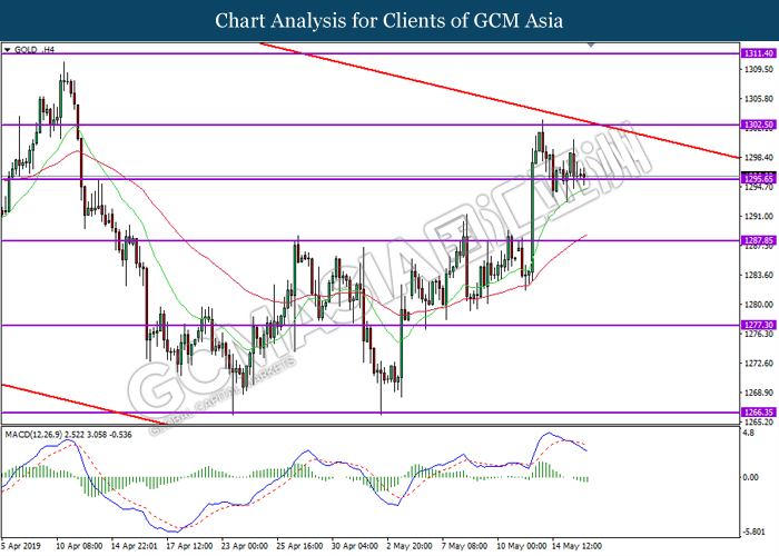 GOLD_, H4: Harga emas telah didagang dengan lebih rendah sementara menguji pada tahap sokongan di 1295.65. MACD yang menunjukkan momentum bearish dengan formasi silang kematian mencadangkan emas untuk melanjutkan kerugiannya selepas ia berjaya untuk memecahkan pada tahap sokongan tersebut.