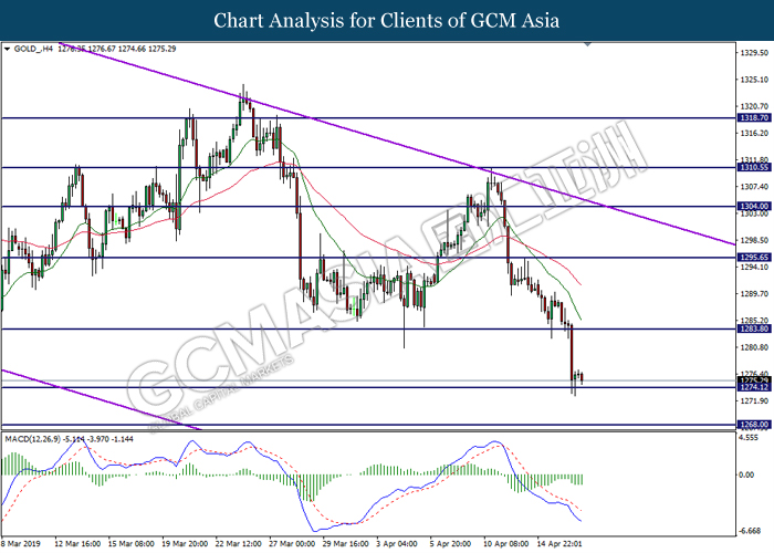 GOLD_, H4: Harga emas telah didagang dengan lebih rendah sementara menguji berdekatan tahap sokongan di 1274.10. MACD yang menunjukkan momentum bearish mencadangkan emas untuk melanjutkan kerugiannya selepas ia berjaya untuk memecahkan pada tahap sokongan tersebut.