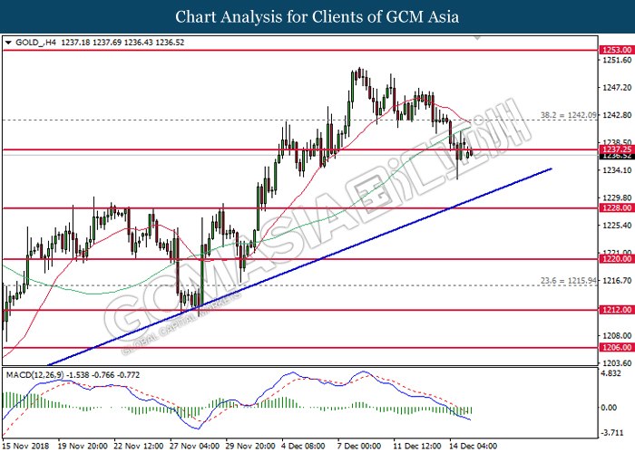 GOLD_, H4: Harga emas telah didagang dengan lebih rendah selepa sia berundur dari paras tingginya. MACD yang memaparkan isyarat bearish mencadangkan harganya untuk meneruskan penurunan dan menuju ke arah garisan trend menaik.