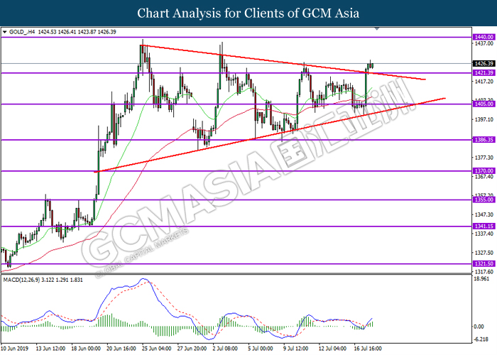 GOLD_, H4: Harga emas telah didagang dengan lebih tinggi berikutan dengan pemecahan dari tahap rintangan sebelumnya di 1421.40. MACD yang memaparkan isyarat bias bullish mencadangkan emas untuk melanjutkan keuntungannya ke arah tahap rintangan 1440.00.