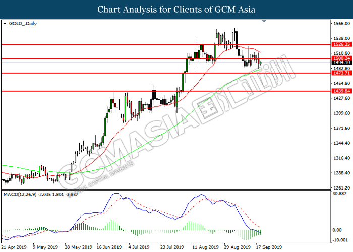 GOLD_Daily: Harga emas yang telah didagang dengan lebih rendah berikutan dengan pengunduran dari tahap rintangan 1500.25. MACD yang memaparkan isyarat bearish mencadangkan harganya untuk meneruskan kerugiannya ke arah tahap sokongan 1473.70.