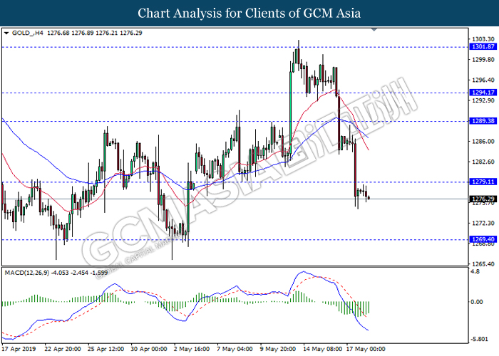 GOLD_, H4: Harga emas telah didagang dengan lebih rendah berikutan dengan pengunduran dari tahap rintangan di 1279.10. MACD yang menunjukkan isyarat bearish yang ketara mencadangkan komoditi ini untuk melanjutkan kerugiannya ke arah tahap sokongan di 1269.40.