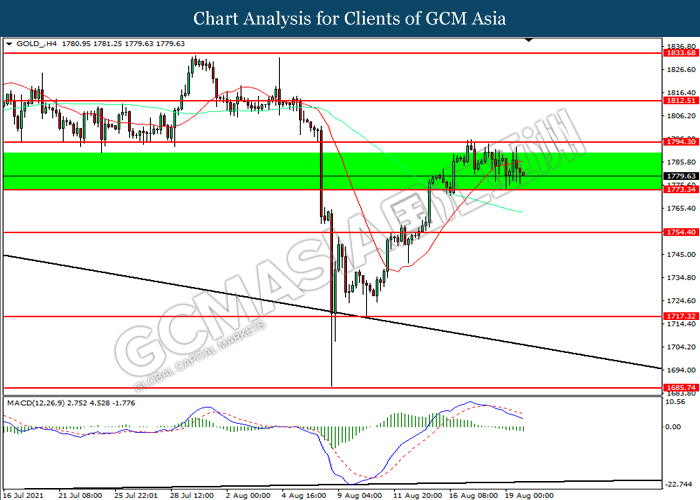 GOLD_, H4: Harga emas telah didagang dengan lebih rendah selepas ia berundur dari tahap rintangan 1794.30. MACD yang memaparkan momentum bearish mencadangkan komoditi ini untuk melanjutkan kerugiannya ke arah tahap sokongan 1773.35