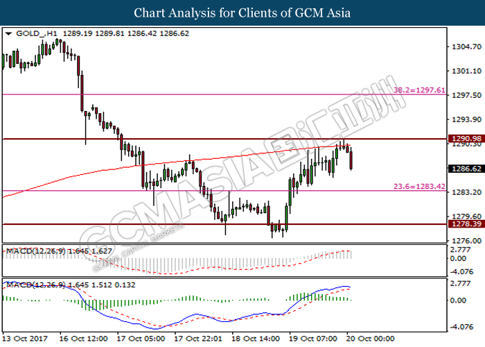 GOLD_, H1: Harga emas telah didagang dengan lebih rendah setelah ia berundur dari tahap rintangan di 1291.00 dan rintangan pada garisan 200-MA. Pembentukan silang kematian oleh garisan isyarat MACD memberi cadangan kepada harga emas untuk mengalami pembetulan teknikal secara jangka masa pendek dan berdagang  dengan lebih rendah ke arah tahap sokongan di 1283.45.