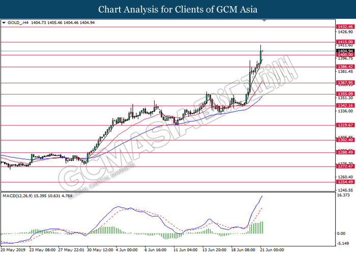 GOLD_, H4: Harga emas telah didagang dengan lebih tinggi berikutan dengan pemecahan dari tahap rintangan sebelumnya di 1400.00. MACD yang memaparkan isyarat bias bullish mencadangkan emas untuk melanjutkan kenaikannya ke arah tahap rintangan di 1415.00.