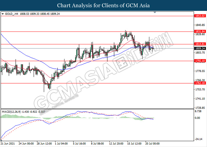 GOLD_, H4: Harga emas telah didagang dengan lebih rendah susulan dengan pengunduran dari tahap rintangan 1814.80. MACD yang memaparkan isyarat bias bearish mencadangkan komoditi ini untuk melanjutkan pengundurannya ke arah tahap sokongan 1792.10.