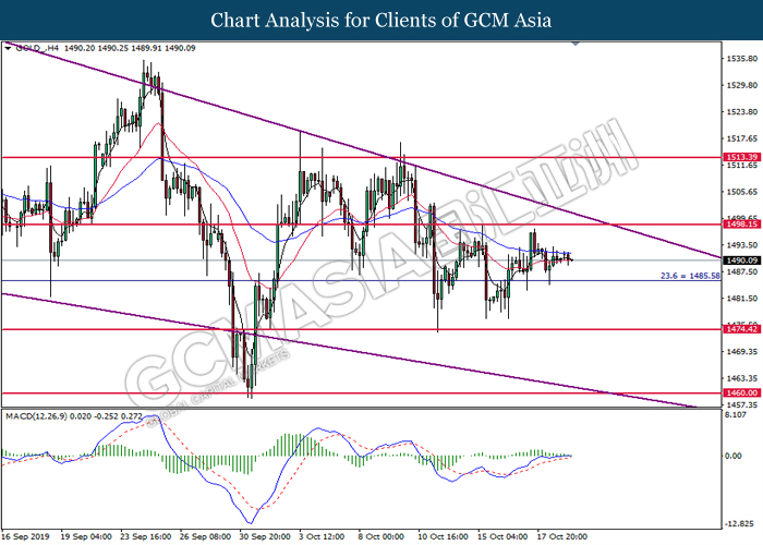 GOLD_, H4: Harga emas telah didagang dengan lebih rendah selepas ia berundur daripada garisan 50 MA (Biru). MACD yang memaparkan penyusutan pada momentum menaik mencadangkan harganya untuk didagang dengan lebih rendah dan menuju ke arah tahap sokongan 1498.15.