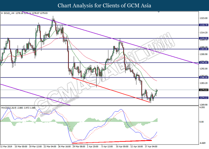 GOLD_, H4: Harga emas telah didagang dengan lebih tinggi berikutan dengan lantunan dari tahap sokongan di 1274.10. MACD yang menunjukkan momentum bullish dengan isyarat ‘positive divergence’ mencadangkan emas untuk melanjutkan keuntungannya ke arah tahap rintangan di 1286.50.