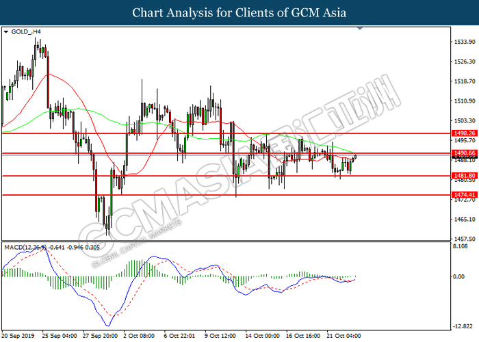 GOLD_, H4: Harga emas telah didagang dengan lebih tinggi sementara kini menguji di tahap rintangan 1490.65. MACD yang memaparkan momentum bullish mencadangkan komoditi ini untuk melanjutkan keuntungannya selepas ia memecah tahap rintangan tersebut.