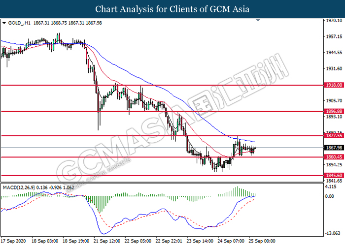 GOLD_, H1: Harga emas telah didagang dengan lebih tinggi selepas ia melantun dari tahap sokongan di 1860.45. MACD yang memaparkan isyarat momentum bullish yang berterusan mencadangkan komoditi ini untuk melanjutkan keuntungannya dan menuju ke arah tahap rintangan di 1877.55.