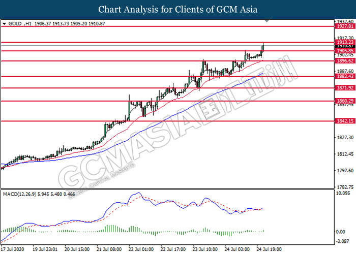 GOLD_, H1: Harga emas telah didagang dengan lebih tinggi sementara ia sedang menguji tahap rintangan 1913.25. MACD yang memaparkan isyarat momentum bullish yang berterusan mencadangkan komoditi ini untuk melanjutkan keuntungannya selepas ia memecah tahap rintangan tersebut.