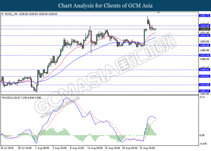 GOLD_, H4: Harga emas telah didagang dengan lebih rendah berikutan dengan pemecahan pada tahap sokongan sebelumnya 1535.00. MACD yang memaparkan isyarat momentum bullish mencadangkan komoditi ini untuk melanjutkan kerugiannya ke arah tahap sokongan 1515.55.
