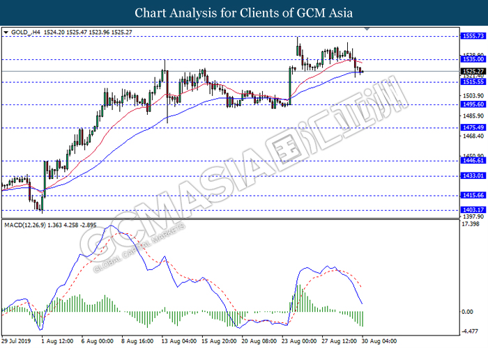 GOLD_, H4: Harga emas telah didagang dengan lebih rendah sementara ia sedang menguji garisan MA 50 (biru). MACD yang memaparkan isyarat bias bearish mencadangkan komoditi ini untuk melanjutkan kerugiannya selepas ia memecah ke bawah garisan MA 50 (biru).