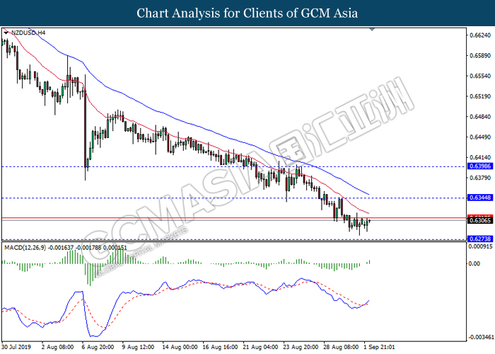 NZDUSD, H4: NZDUSD telah didagang dengan lebih rendah sementara ia sedang menguji tahap sokongan 0.6275. Namun, MACD yang memaparkan isyarat momentum bearish yang berkurangan mencadangkan pasangan ini untuk mengalami pembetulan teknikal dalam jangka pendek ke arah tahap rintangan 0.6345.