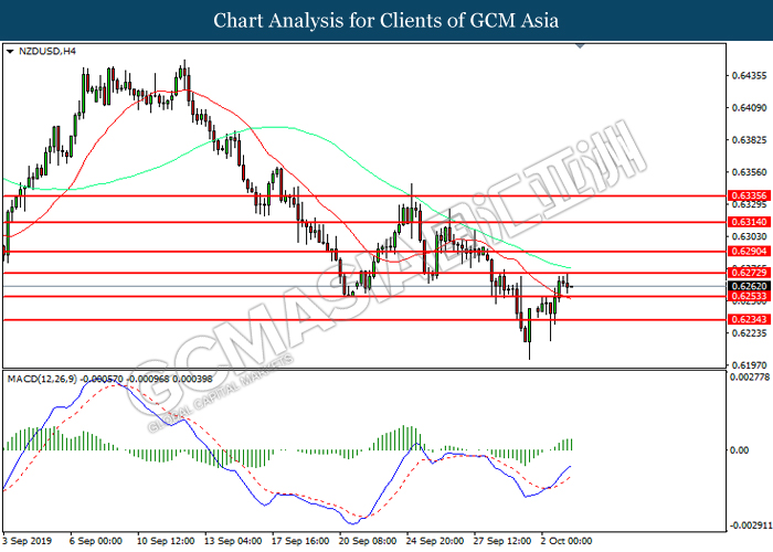 NZDUSD, H4: NZDUSD telah didagang dengan lebih rendah selepas ia berundur dari tahap rintangan 0.6275. Namun, MACD yang memaparkan momentum bullish mencadangkan pasangan ini untuk mengalami pembetulan teknikal bagi jangka pendek.