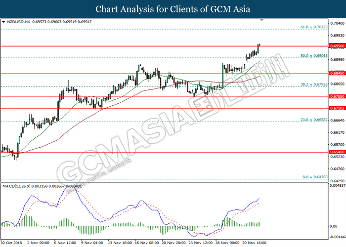 NZDUSD, H4: NZDUSD telah didagang dengan lebih rendah selepas ia berundur dari paras tingginya. MACD yang mula untuk membentuk corak silang kematian mencadangkan pasangan ini untuk didagang dengan lebih rendah bagi jangka pendek sebagai pembetulan teknikal.