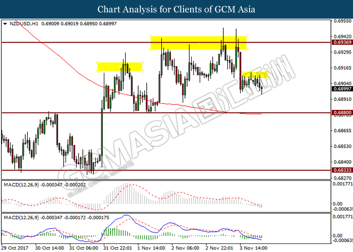 NZDUSD, H1: NZDUSD telah didagang dengan lebih rendah setelah berundur dari tahap rintangan di 0.6935. Pembentukan corak lilin head and shoulder dan negative divergence oleh garisan isyarat MACD memberi cadangan kepada pasangan tersebut untuk melanjutkan kerugian ke sokongan pada garisan 200-MA dan tahap sokongan di 0.6880.