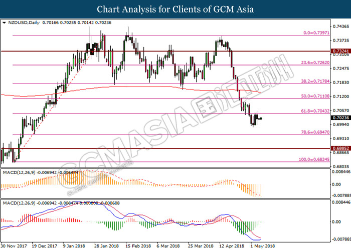 NZDUSD, D1: NZDUSD telah didagang dengan lebih rendah setelah ia memecah tahap sokongan di 0.7040. Namun, garisan isyarat MACD yang hampir membentuk silang keemasan memberi cadangan kepada pasangan tersebut untuk mengalami pembetulan teknikal secara jangka masa pendek bagi didagang dengan lebih tinggi ke paras terendah sebelum tersebut.