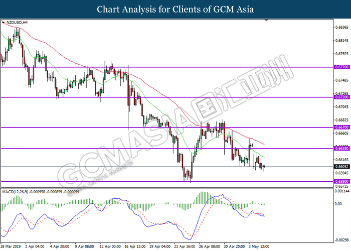 NZDUSD, H4: NZDUSD telah didagang dengan lebih rendah berikutan dengan pengunduran dari garisan MA-20 (hijau). MACD yang menunjukkan momentum bearish mencadangkan pasangan ini untuk melanjutkan pengundurannya ke arah tahap sokongan di 0.6580.