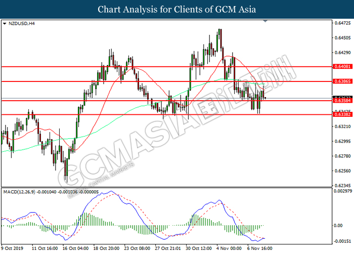 NZDUSD, H4: NZDUSD telah didagang dengan lebih rendah sementara kini menguji di tahap sokongan 0.6360. Namun, MACD yang memaparkan momentum bearish yang berkurangan mencadangkan pasangan ini untuk mengalami pembetulan teknikal.