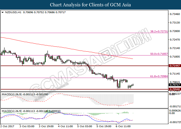 NZDUSD, H1: NZDUSD telah didagang dengan lebih tinggi selepas ia melantun dari tahap sokongan di 0.7055. Pembentukan pin bar bullish dan kemungkinan garisan isyarat MACD untuk membentuk positive divergence memberi cadangan kepada pasangan tersebut untuk mendapat momentum bullish secara jangka masa yang pendek demi berdagang dengan lebih tinggi ke arah tahap rintangan di 0.7095.