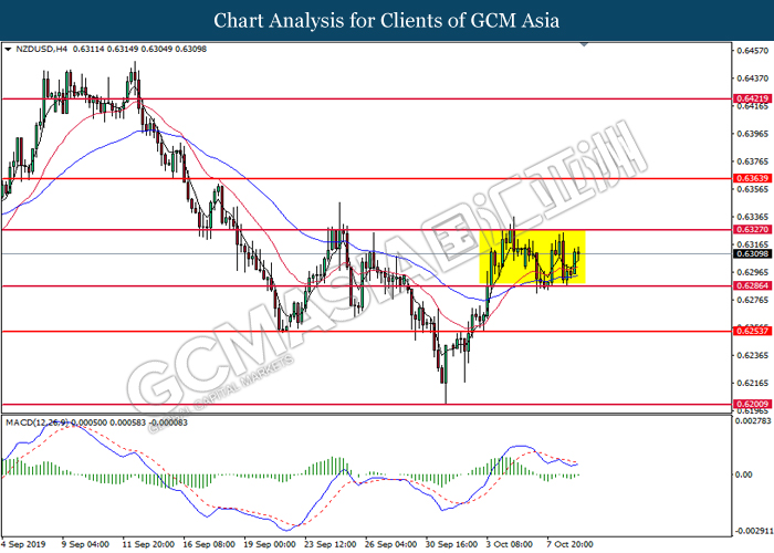NZDUSD, H4: NZDUSD telah didagang dengan lebih tinggi selepas ia melantun dari tahap sokongan 0.6285. MACD yang memaparkan penyusutan pada momentum menurun mencadangkan pasangan ini untuk didagang dengan lebih tinggi dan menuju ke arah tahap rintangan 0.6325.