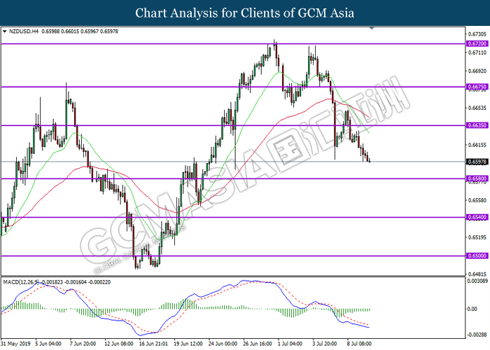 NZDUSD, H4: NZDUSD telah didagang dengan lebih rendah berikutan dengan pengunduran dari tahap rintangan 0.6635. MACD yang memaparkan momentum bearish yang berterusan mencadangkan pasangan ini untuk melanjutkan kerugiannya ke arah tahap sokongan 0.6580.