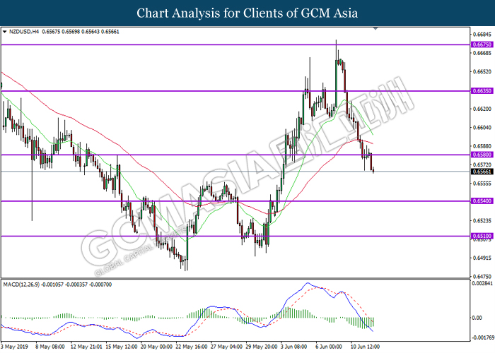 NZUDSD, H4: NZDUSD telah didagang dengan lebih rendah susulan dengan pemecahan dari tahap sokongan sebelumnya di 0.6580. MACD yang menunjukkan isyarat bias bearish mencadangkan pasangan ini untuk melanjutkan kerugiannya ke arah tahap sokongan di 0.6540.