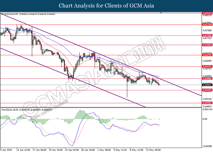NZDUSD, H4: NZDUSD telah didagang dengan lebih rendah berikutan dengan pengunduran dari tahap rintangan di 0.6585. MACD yang menunjukkan momentum bearish dengan formasi silang kematian mencadangkan pasangan ini untuk melanjutkan kerugiannya ke arah tahap sokongan di 0.6545.