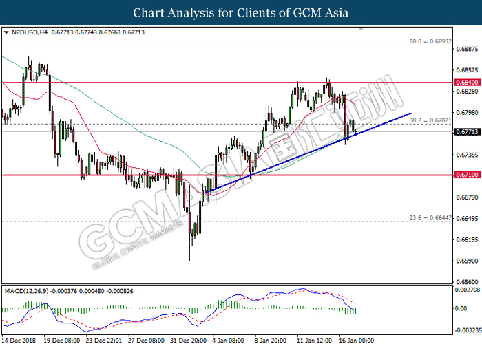 NZDUSD, H4: NZDUSD telah didagang dengan lebih rendah sementara kini menguji berhampiran dengan garisan trend menaik. MACD yang memaparkan isyarat bearish mencadangkan pasangan ini untuk meneruskan kerugiannya selepas ia berjaya untuk memecahkan garisan trend tersebut.