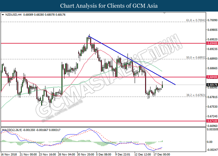 NZDUSD, H4: NZDUSD telah didagang dengan lebih tinggi selepas ia melantun dari tahap sokongan 0.6780. MACD yang mula untuk membentuk isyarat bullish mencadangkan pasangan ini untuk meneruskan kenaikannya pada jangka pendek selepas ia menutup niaga di atas garisan 20-MA (merah).