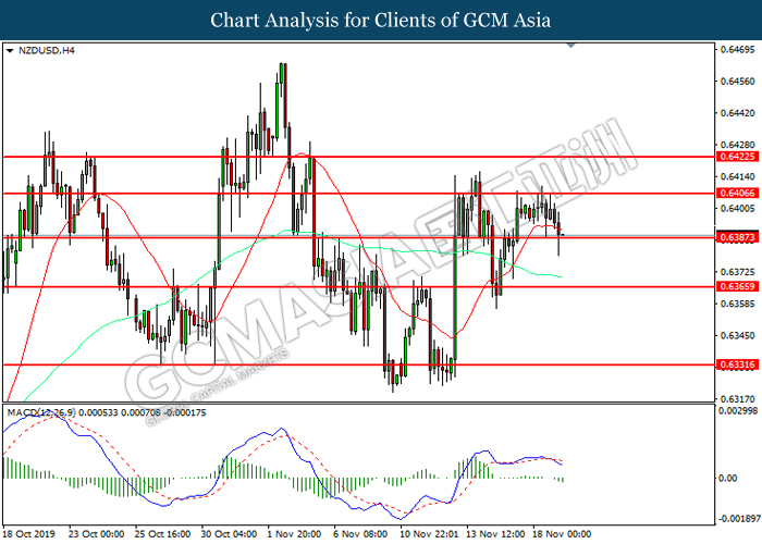 NZDUSD, H4: NZDUSD telah didagang dengan lebih rendah sementara kini menguji di tahap sokongan 0.6385. MACD yang memaparkan momentum bearish mencadangkan pasangan ini untuk melanjutkan kerugiannya selepas ia memecah tahap sokongan tersebut.