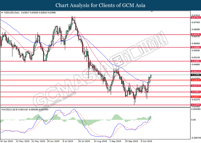 NZDUSD, Daily: NZDUSD telah didagang dengan lebih tinggi berikutan dengan pemecahan pada tahap rintangan sebelumnya. MACD yang memaparkan momentum menaik mencadangkan pasangan ini untuk didagang dengan lebih tinggi dan menuju ke arah tahap rintangan 0.6420.