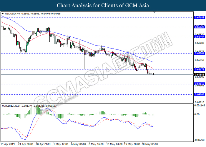 NZDUSD, H4: NZDUSD telah didagang dengan lebih rendah berikutan dengan pemecahan dari tahap sokongan sebelumnya di 0.6515. MACD yang memaparkan momentum bearish yang berterusan mencadangkan pasangan ini untuk melanjutkan kerugiannya ke arah tahap sokongan di 0.6460.