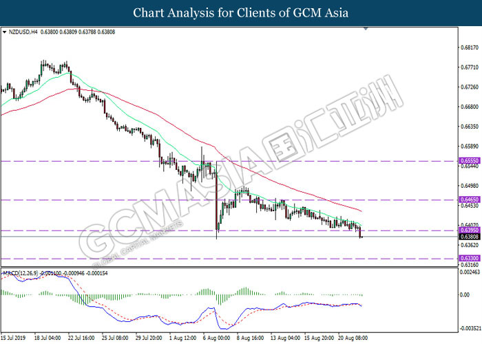 NZDUSD, H4: NZDUSD telah didagang dengan lebih rendah susulan dengan pemecahan pada tahap sokongan sebelumnya di 0.6395. MACD memaparkan isyarat bias bearish mencadangkan pasangan ini untuk melanjutkan kerugiannya ke arah tahap sokongan 0.6330.