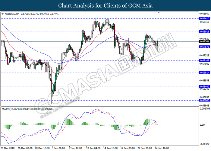 NZDUSD, H4: NZDUSD telah didagang dengan lebih tinggi berikutan dengan lantunan dari tahap sokongan 0.6755 baru-baru ini. MACD yang memaparkan momentum bearish mencadangkan pasangan ini untuk melanjutkan lantunannya ke arah tahap rintangan 0.6800.