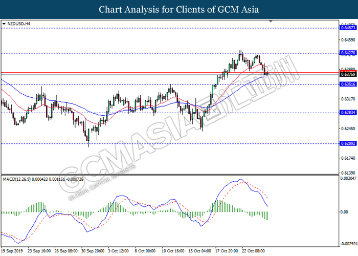 NZDUSD, H4: NZDUSD telah didagang dengan lebih rendah sementara ia sedang menguji berhampiran dengan tahap sokongan. MACD yang memaparkan isyarat momentum bearish yang berterusan mencadangkan pasangan ini untuk melanjutkan kerugiannya selepas ia memecah tahap sokongan tersebut.