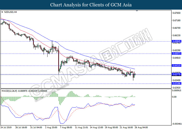 NZDUSD, H4: NZDUSD telah didagang dengan lebih rendah sementara menguji pada tahap sokongan 0.6375. MACD yang memaparkan isyarat bias bearish mencadangkan pasangan ini untuk melanjutkan kerugiannya selepas ia berjaya untuk memecahkan pada tahap sokongan tersebut.