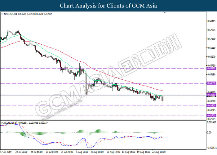 NZDUSD, H4: NZDUSD telah didagang dengan lebih tinggi sementara menguji pada tahap rintangan 0.6395. Namun, oleh kerana kekurangan isyarat dan momentum daripada MACD, pemecahan atau pengunduran dari tahap rintangan tersebut adalah diperlukan bagi mendapat pengesahan yang selanjutnya sebelum memasuki ke dalam pasaran.